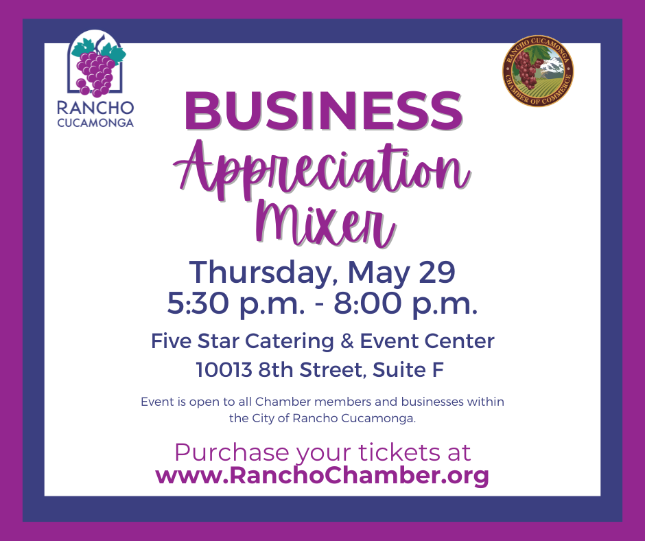 Join the City of Rancho Cucamonga and the Rancho Cucamonga Chamber of Commerce for the Business Appreciation Mixer on Thursday, May 29 from 5:30 p.m. to 8:00 p.m. at Five Star Catering & Event Center (10013 8th Street, Suite F).