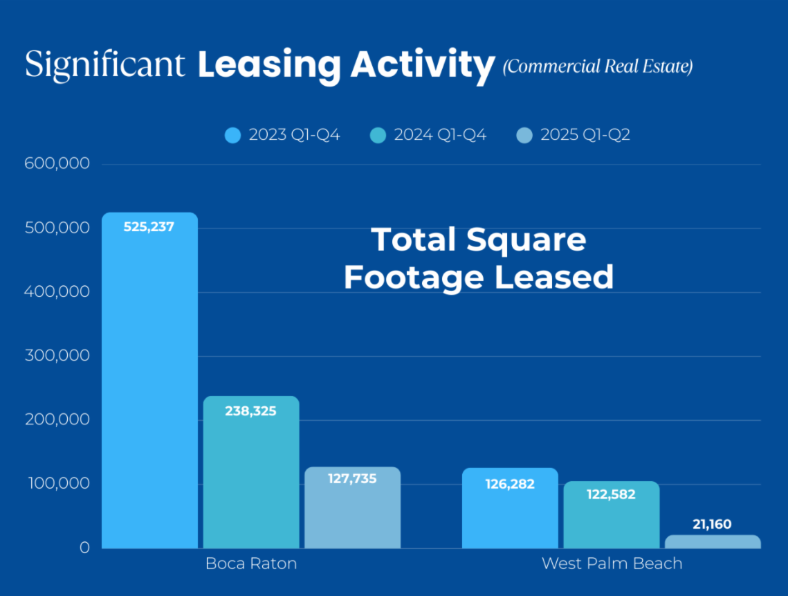 Boca Raton boasted 127,735 sq. ft. of significant commercial leasing activity in the first half of 2025 — far surpassing West Palm Beach’s 21,160 sq. ft. This strong performance reflects the City's prime location, top-tier commercial spaces, and business-friendly environment, cementing Boca Raton as South Florida’s go-to destination for growth and investment.
