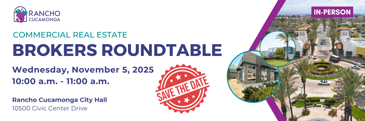 The City of Rancho Cucamonga invites Commercial Real Estate Brokers to the upcoming Brokers Roundtable on Wednesday, November 5 at 10:00 a.m. This dynamic event is designed to foster collaboration and provide the latest updates on development projects throughout the City.