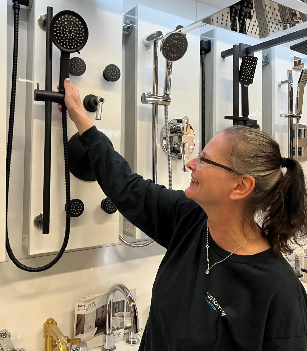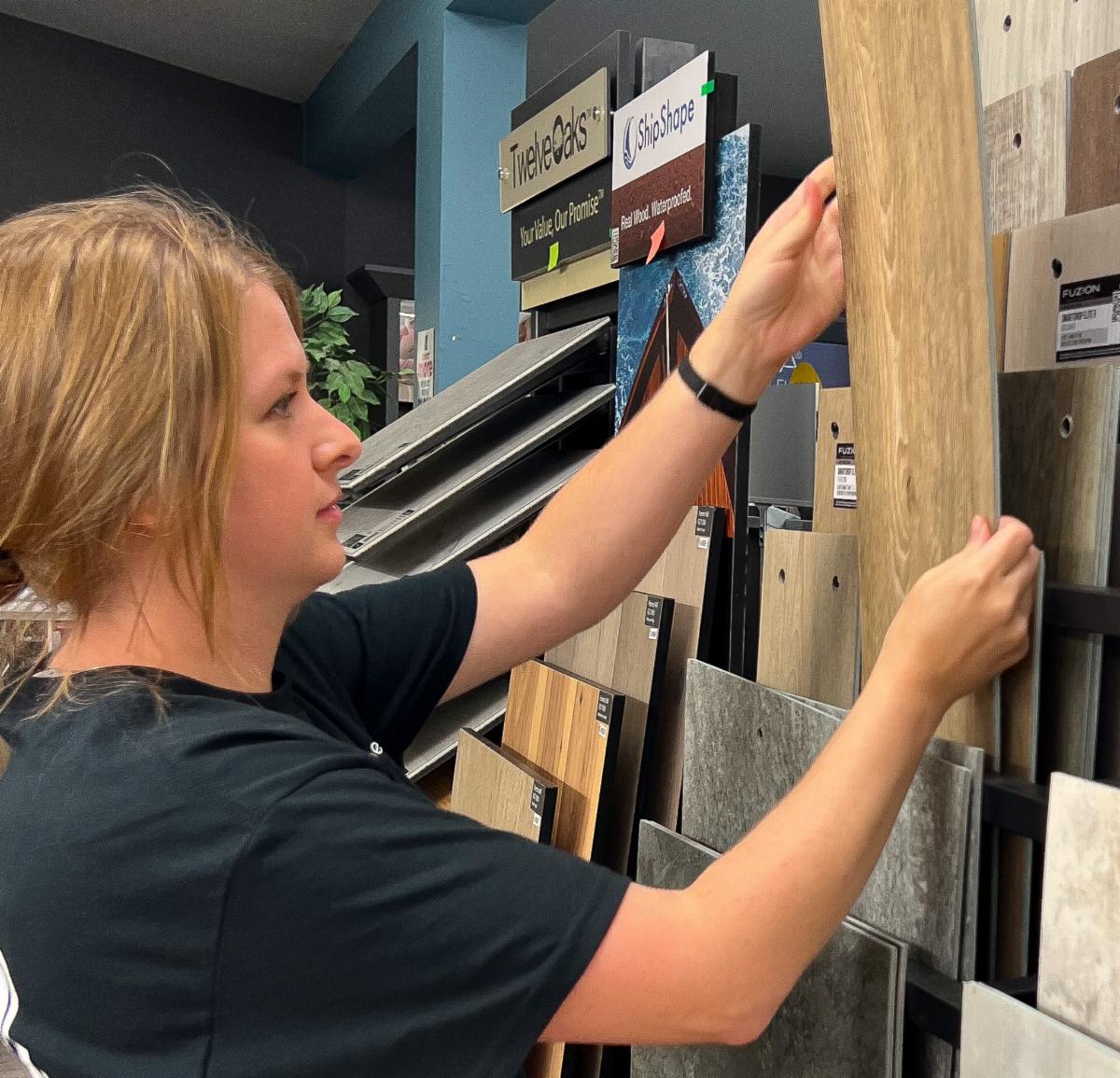Top feature photo: The Custom Decor Carpet One team led by Matt VanderBaaren (holding pup Maggie). The team from left: Carrie Kizell, Matt, Jason Harmsma, Emily Sprague, Matt Seaman, Robin Canton, Chris Daubney and Doug McKeown. | Above: Matt looking at plans; Below: Carrie with shower and bath selections; Emily in the flooring department. | | |