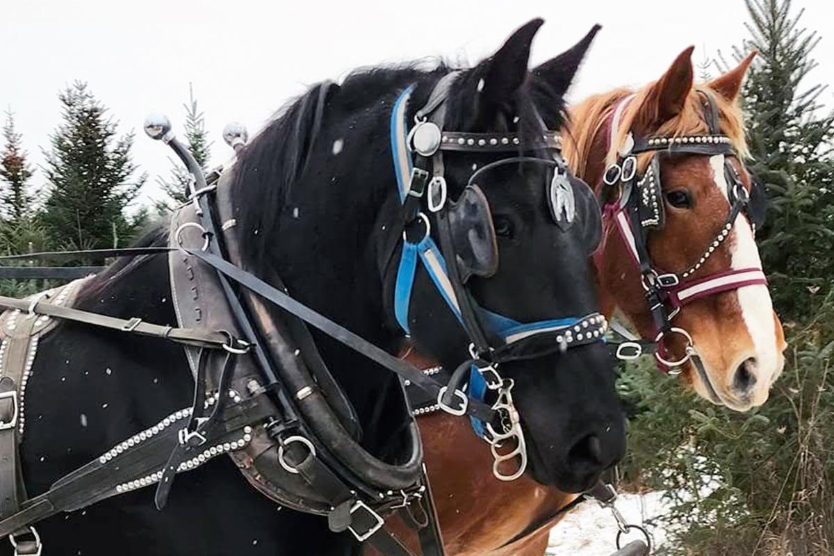 Above - the horses are dressed and ready to lead guests on a winter wagon ride; a full Balsam fir with a few candy canes; strong farm hands work the baler, securing trees for transport; a dacshound helps her family look for the perfect tree.