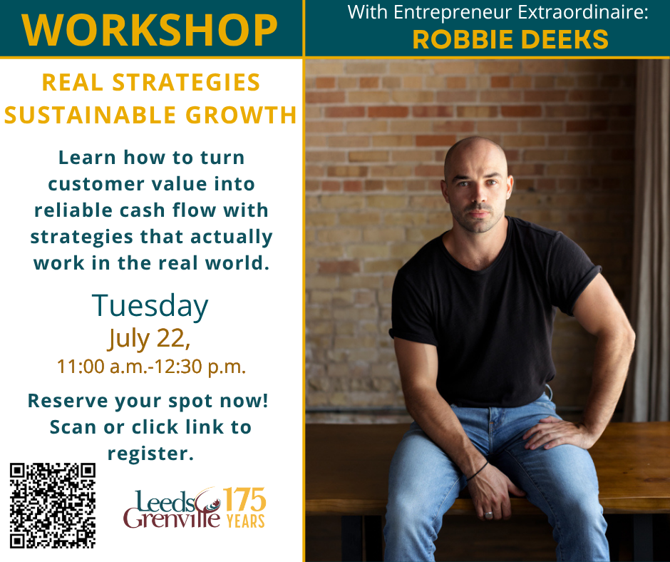 Robbie will share powerful, hard-earned insights from over a decade of hands-on experience growing companies-from Shopify Plus to ventures with Gary Vaynerchuk. You’ll walk away with practical strategies to create your own customer-generating engine and take your business to the next level faster and smarter. The workshop will take place at 25 Central Avenue West in Brockville, the offices of the United Counties of Leeds and Grenville.