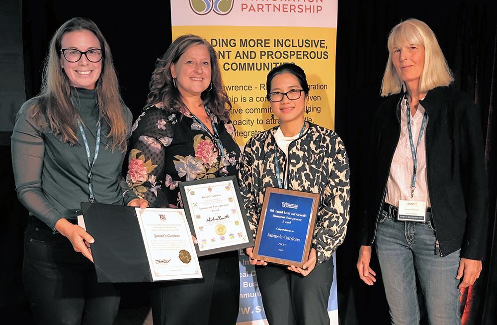 | | Photo: Melissa Francis from the St. Lawrence-Rideau Immigration Partnership, Tracy MacDonald of CSE Consulting, Immigrant Entrepreneur Award Recipient Trang Vu with business partner Janine Van Boxtel of Janine’s Gardens in Township of Augusta. | | |