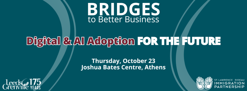 | | * For more on funding, visit the Leeds Grenville Economic Development funding resources page. To receive advice on whether your business could qualify, email Shelbi McFarlane, Business Development Officer or call her at 613-342-3840 x 5361. | | Digital & AI Adoption For The Future: Registration Open | | Be part of an energizing evening with Leeds Grenville Small Business. Digital & AI Adoption for the Future is this year's Bridges to Better Business theme. Discover how digital tools and AI are reshaping the future of business, learn directly from industry leaders and connect with fellow entrepreneurs. Walk away with fresh insights and practical strategies you can use immediately to accelerate your business's success. | | | | |