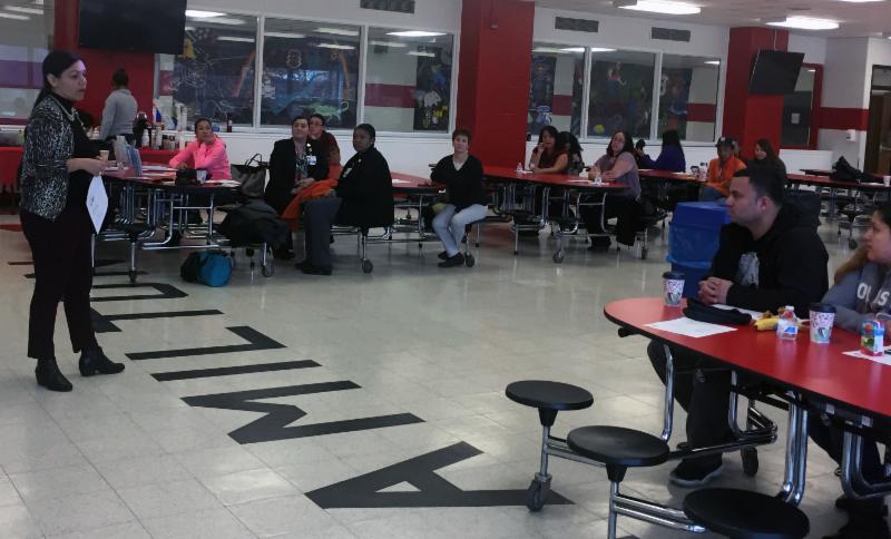 Luarben Bencosme of the Westchester Institute for Human Development speaks to parents in the AHHS cafeteria. |