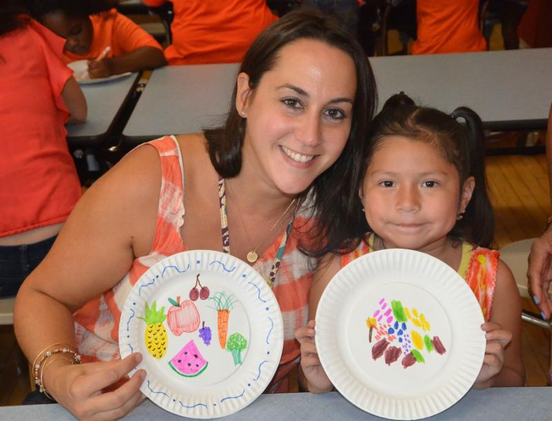 Three stations were set up close to the planting area, each one devoted to a specific learning activity. At one table, children wrote their names, helped by a parent. At another table, they colored flower petals that were eventually placed around their faces.