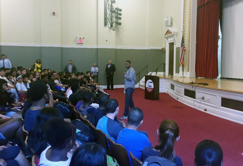 Inky Johnson speaks to students in the high school auditorium.