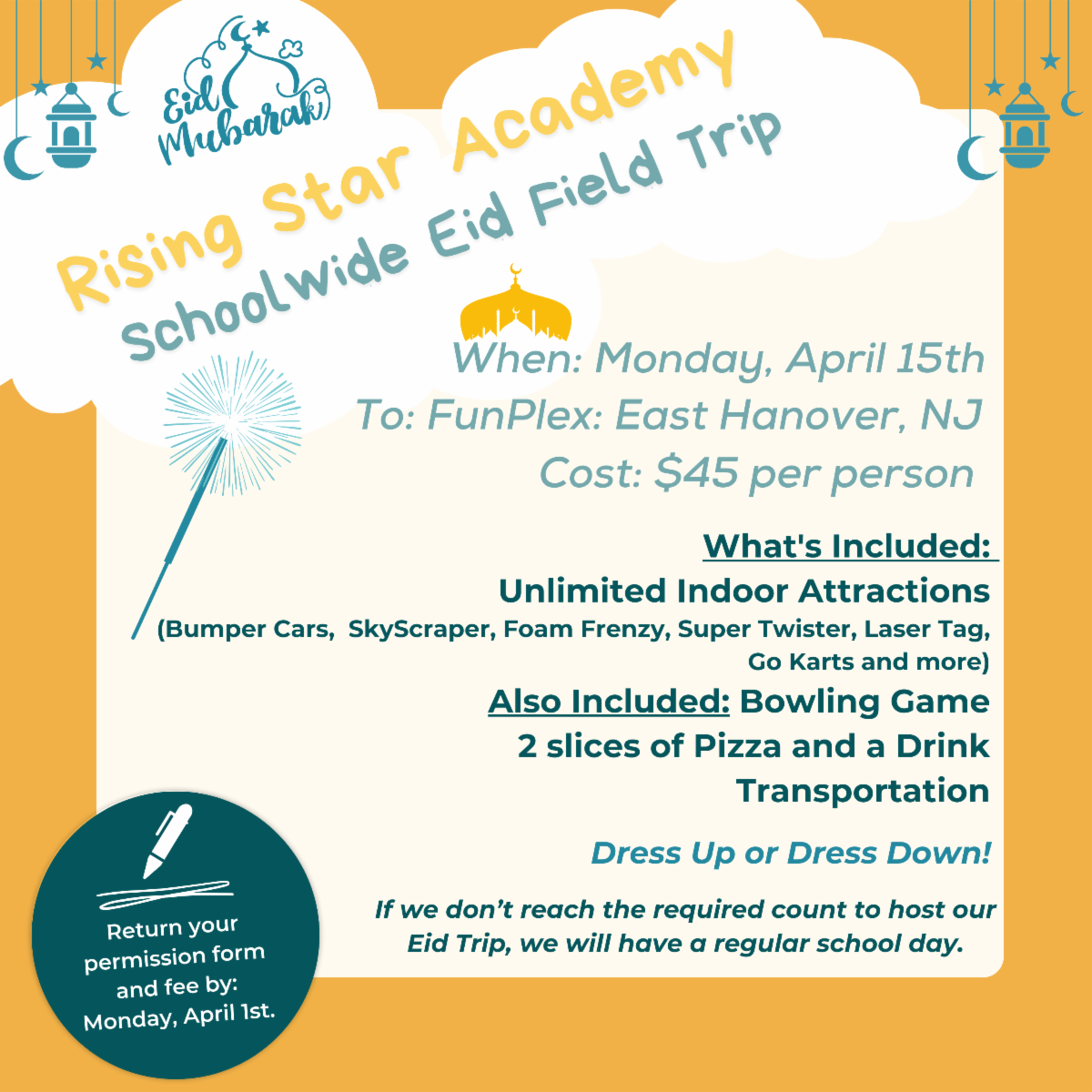 - Our school-wide Eid field trip is scheduled for Monday, April 15th.