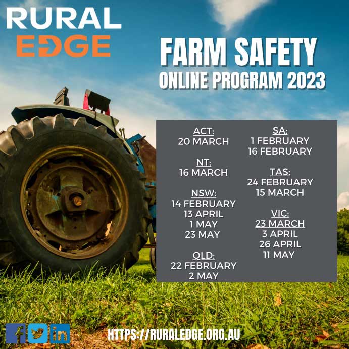 A series of online Farm Safety workshops is being held across the country, based on Federal legislation and nuanced to each state/territory's legislation. The workshops are tailored to the four largest agricultural industries: broadacre, horticulture, viticulture and livestock.