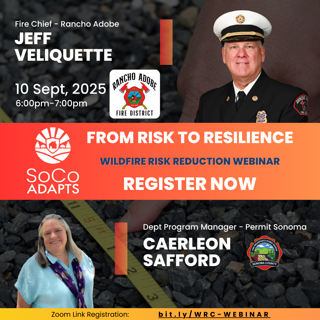 La temporada de incendios forestales ya está aquí, y la preparación es fundamental. Únase a Permit Sonoma, los jefes de bomberos locales y los especialistas en prevención de incendios forestales el 10 de septiembre en un taller gratuito en línea que le proporcionará herramientas prácticas para reducir los riesgos en su hogar y reforzar la capacidad de nuestra comunidad para sobrevivir a un incendio forestal.