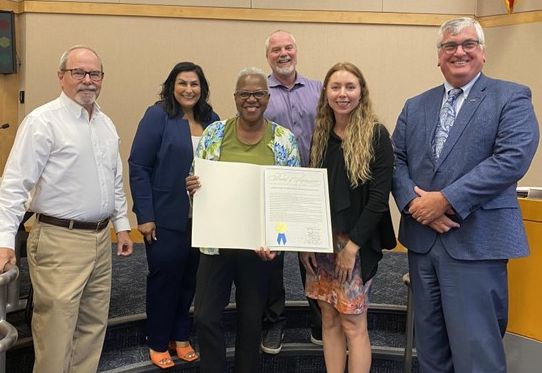 La Junta de Supervisores proclamó el 26 de agosto como el Día de la Igualdad de la Mujer en una resolución dorada presentada a Melanie Jones-Carter, en el centro, vicepresidenta de la Comisión sobre la Condición Jurídica y Social de la Mujer.