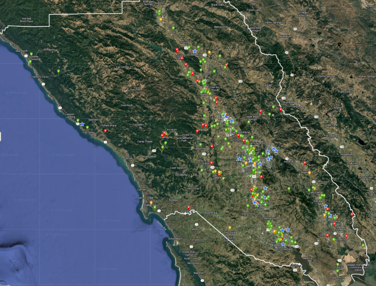 Los iconos verdes, rojos y naranjas muestran la ubicación de las estaciones de recarga existentes en el condado de Sonoma. Las estrellas azules identifican los emplazamientos propuestos.