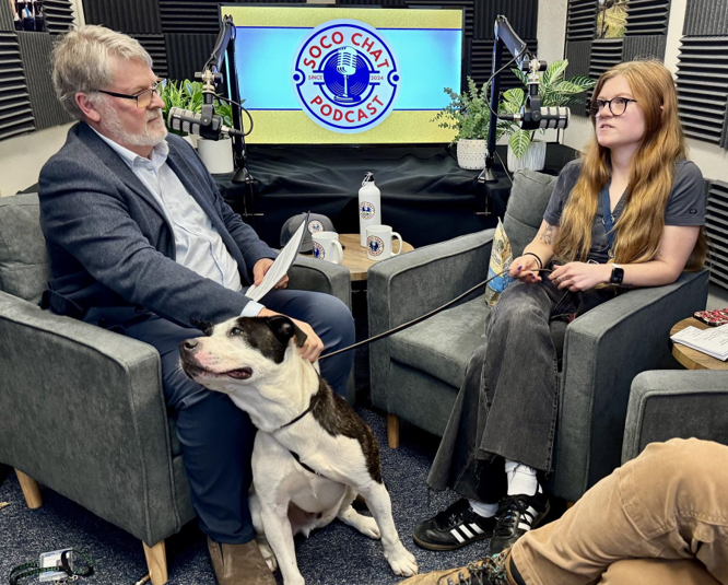 El director de comunicaciones del condado, Paul Gullixson, a la izquierda, habla con Emma Diemert, supervisora del refugio de animales del condado de Sonoma, y Marlow, un pitbull terrier absolutamente adorable que resulta ser ciego, mientras graban un nuevo episodio de SoCo Chat.