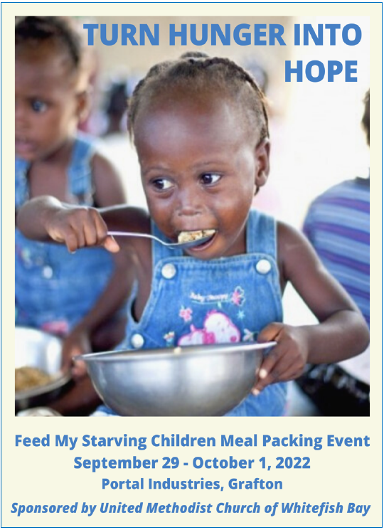 There will be a meal packing event from September 29-October 1 for world hunger organization, Feed My Starving Children. We expect to pack 125,000 meals at eight 2-hour sessions. Meals will be shipped to countries facing severe food shortages. All are welcome to participate. You can register for a session at FMSC.org/Volunteer/ Grafton, WI event or by emailing Kathy Schluter at kschluter505@gmail.com. The event is sponsored by the United Methodist Church of Whitefish Bay and will take place at Portal Industries in Grafton.
