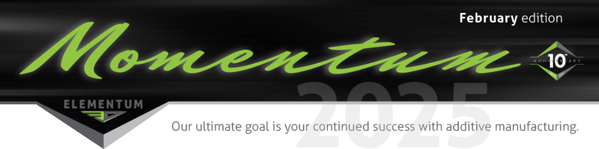 Elementum 3D’s first steps into 2025 have directly benefited from the momentum built throughout 2024. Last year saw substantial progress on many initiatives and company-wide achievements in support of our customer’s additive manufacturing (AM) goals and we are privileged to work with forward thinking pioneers in their pursuit to apply AM technology to optimize their products and applications.