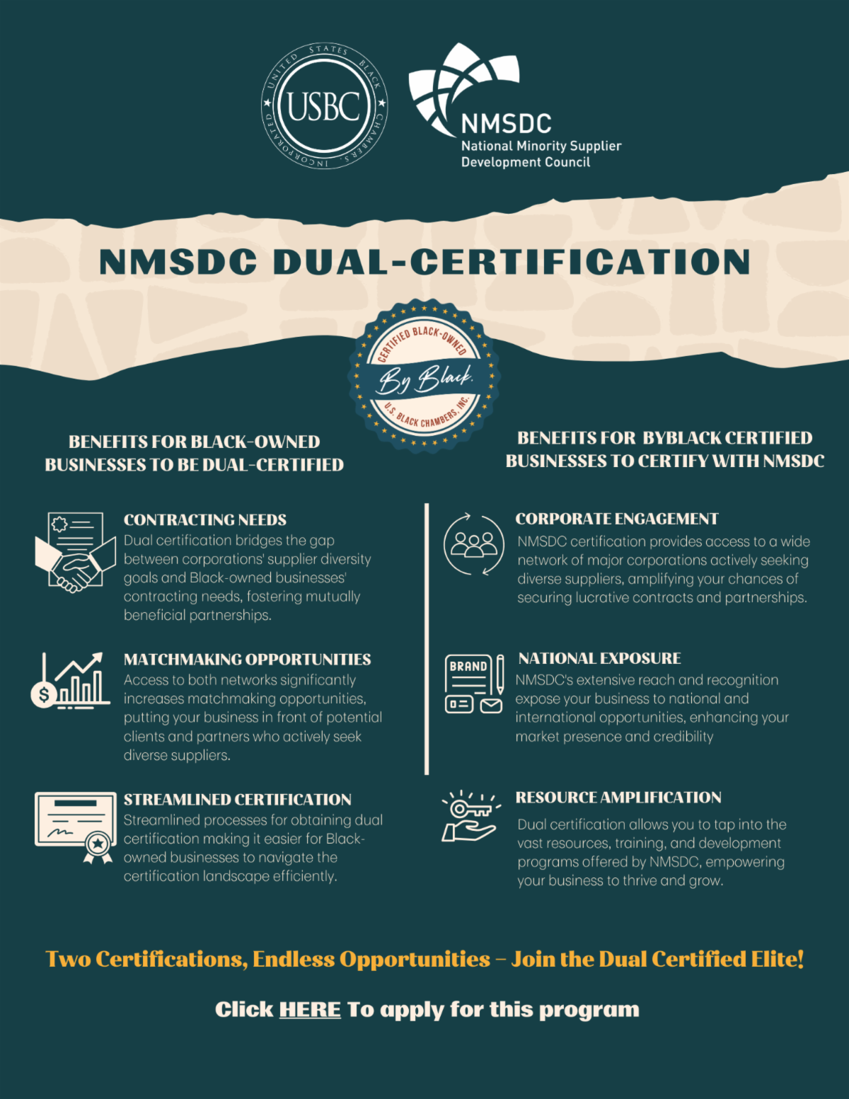 We invite you to seize the power of dual certification – a game-changer for Black-owned businesses! By becoming certified with both NMSDC MBE and USBC ByBlack, you'll open doors to unmatched opportunities, exclusive networks, and contracts with major corporations actively promoting diversity.