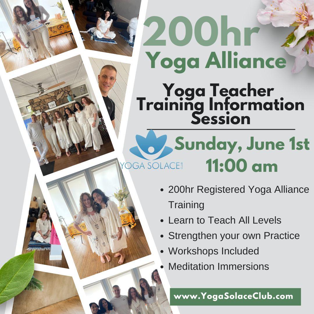 Join us for a FREE Info Session to discuss our Yoga Alliance approved Yoga Solace 200hr Teacher Training Program. We are very excited and proud of this program which is exclusive to Yoga Solace Club. This program will be held at our studio, with a virtual option.