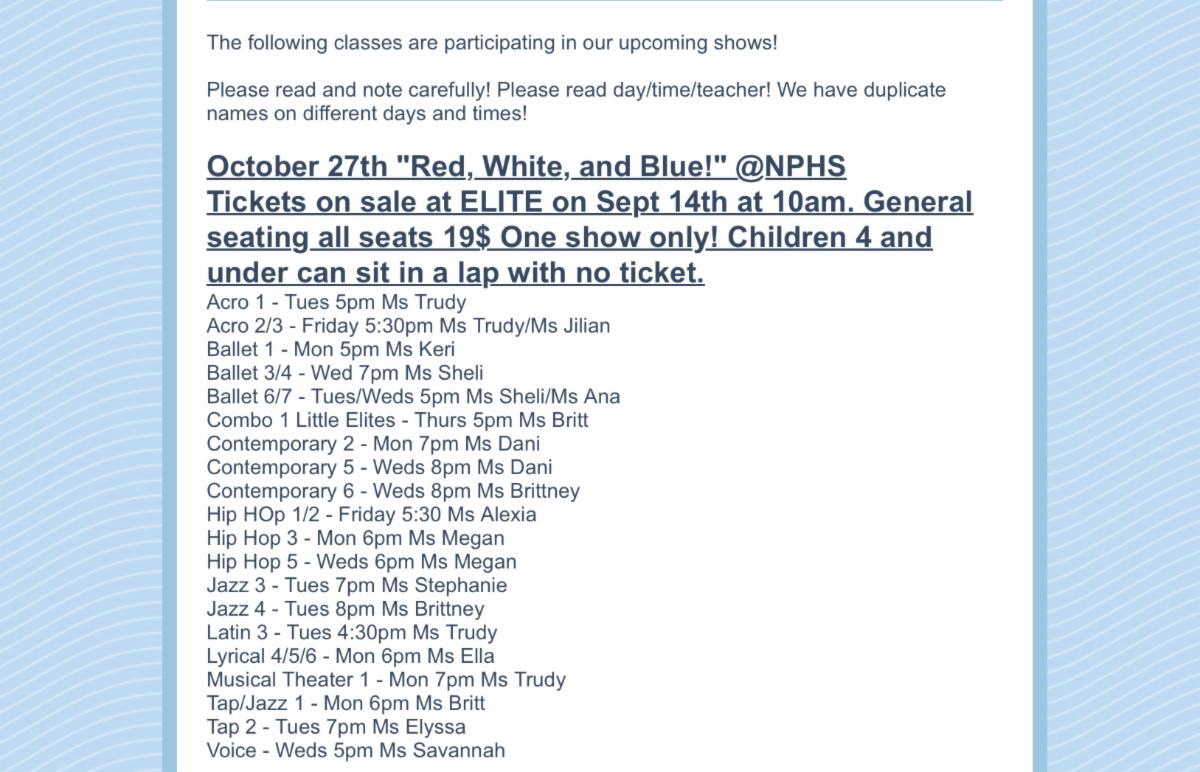 October Show News!  "Red, White, and Blue!" Sunday, October 27th at NPHS Curtain: 7:00pm