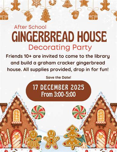 Kids are invited to join us for a sweet and creative afternoon! We’ll be building “gingerbread” houses using graham crackers, frosting, and lots of candy to bring our masterpieces to life. This hands-on program is perfect for kids who love to build, decorate, and get a little messy—after-school fun at its best!