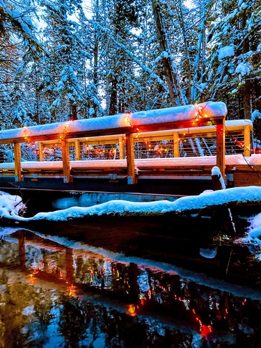 Join us for a magical evening as we light up the bridges of our boardwalk with colorful lights and lanterns for one night only. Enjoy a 1/3 mile winter stroll on the boardwalk to the dock with the bridges lit up with lights, and then warm up with a campfire and hot cocoa at the pavilion. Inside the Center we will have a variety of holiday crafts to make! You can come any time during this two-hour "open house" style event and walk the self-guided trail, enjoy the fire, and make crafts in the Center. Snowshoes are available for rent if there is deep snow.