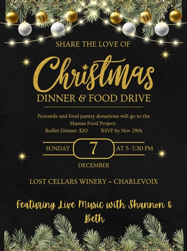 Please join us for a delightful evening dinner while we play your favorite Christmas carols and songs! Lost Cellars is hosting a lovely buffet dinner with proceeds and food donations going to Manna Food Project!
