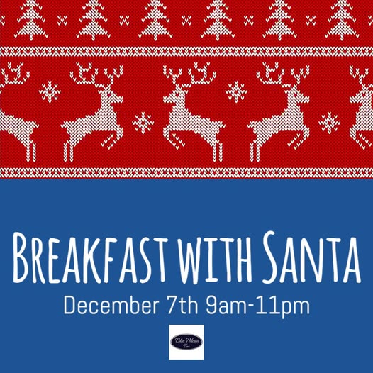 Breakfast with Santa at The Blue Pelican in the original dining room. Breakfast: Pancakes, scrambled eggs and Sausage for 7.99 per person.