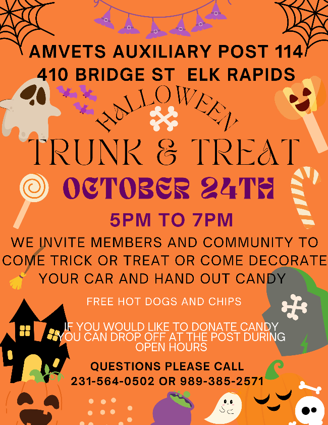 October 24, Halloween Trunk & Treat at Amvets, 5 to 7pm