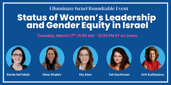 We begin with a powerful virtual conversation on the Status of Women's Leadership and Gender Equity in Israel. This special webinar will explore the issues shaping women’s leadership and Israeli society, featuring several Elluminate Collective members who are leading some of Israel’s most impactful nonprofit organizations. The program will focus on the status of women, preventing violence against women, reproductive rights, and health. As Israel enters a new phase focused on recovery and rebuilding, it will offer a timely and meaningful update for those committed to advancing gender equity.