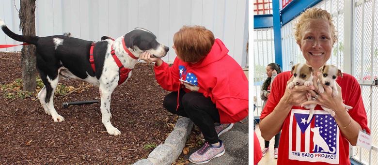 Left: Barbara comforts newly arrived Steve at the airport after he gets off his Freedom Flight in New Jersey. Right: She welcomes two puppies who came to the Spayathon for Puerto Rico last November.