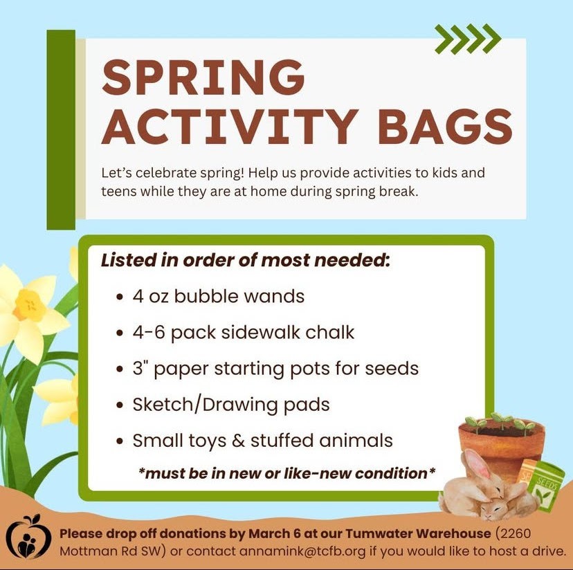 Spring Activity Bags: The Food Bank is planning to provide activities for children. See their ad below to see how you can help.
