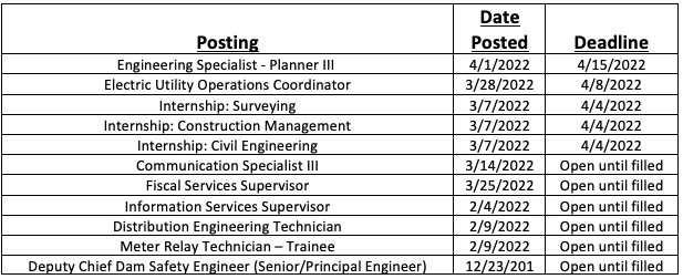 We are pleased to announce the following opportunities are currently available here at EWEB!