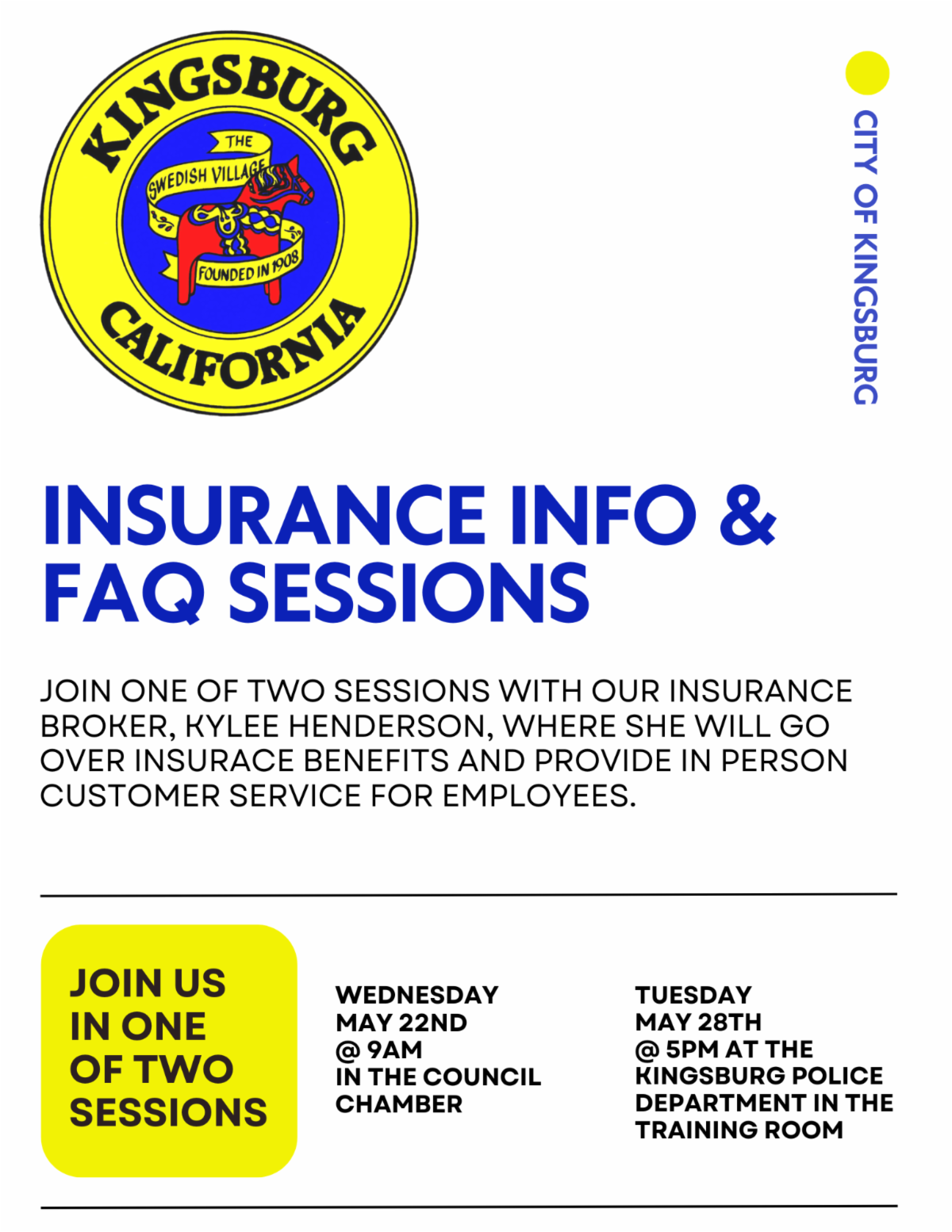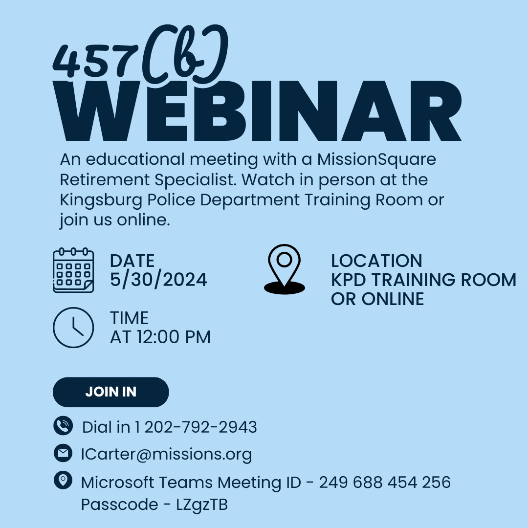 To get the most out of your plan, attend the upcoming online webinar on Thursday, May 30, 2024, at 12:00pm (PST). To join the webinar, use Microsoft Teams and meeting ID 249 688 454 256, and passcode LZgzTB. Employees are invited to watch this webinar in person at the Kingsburg Police Department. Snacks will be provided.