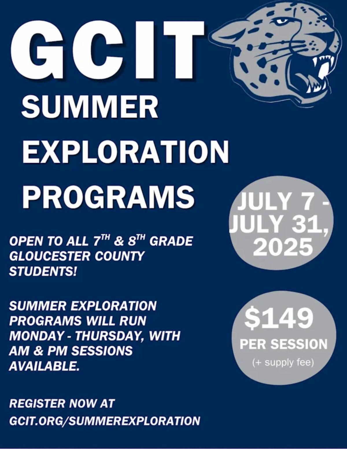 Check out programing at GCIT this summer! Open to all 7th and 8th grade Gloucester County Students. Programs are available in Automotive, Baking, Biological Science, Computer Science, Construction and MORE!