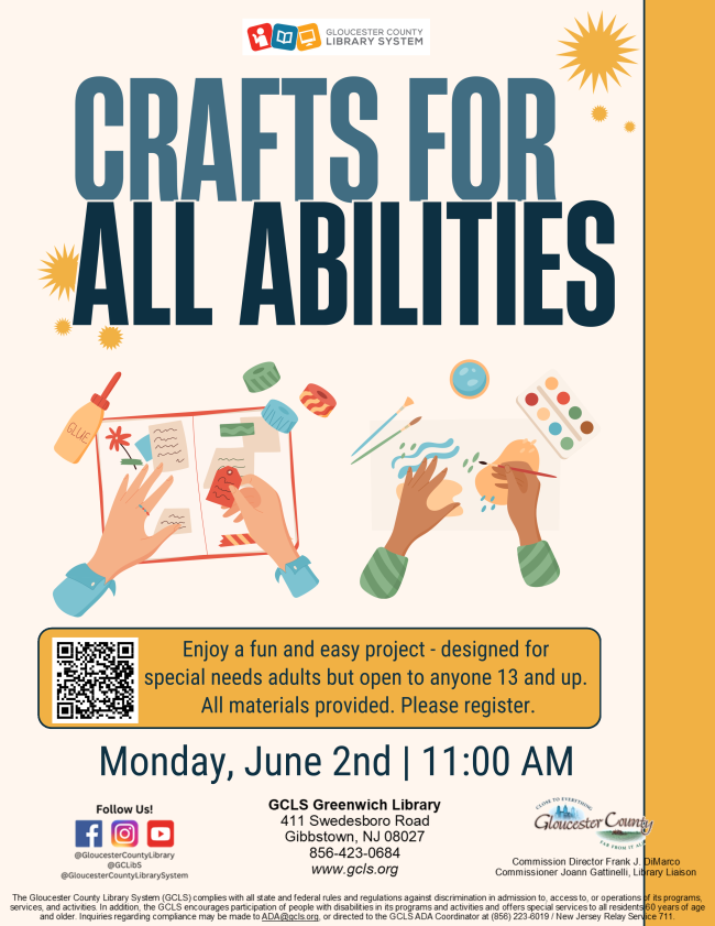 | | Gloucester County Library | | Spring into action with the Gloucester County Library’s exciting lineup of events this June! From engaging workshops and creative classes to fun-filled activities for all ages, there's something for everyone to enjoy. Join us as we celebrate the season with fresh ideas, new skills, and, of course, plenty of opportunities to connect with your community. Check these three opportunities out below or visit the GCLS Website for the full June calendar. | | |