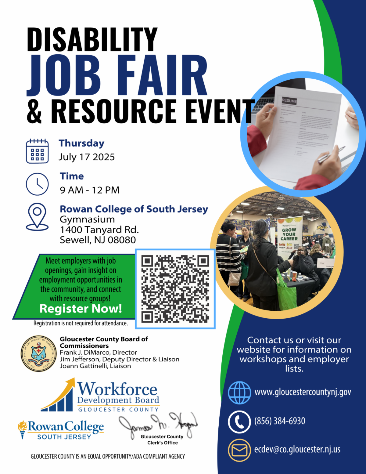 The Gloucester County Disability Job Fair & Resource Event will take place June 17, 2025 from 9 a.m. to 12 p.m. at Rowan College of South Jersey. Meet employers with job openings, gain insight on employment opportunities in the community, and connect with resource groups!