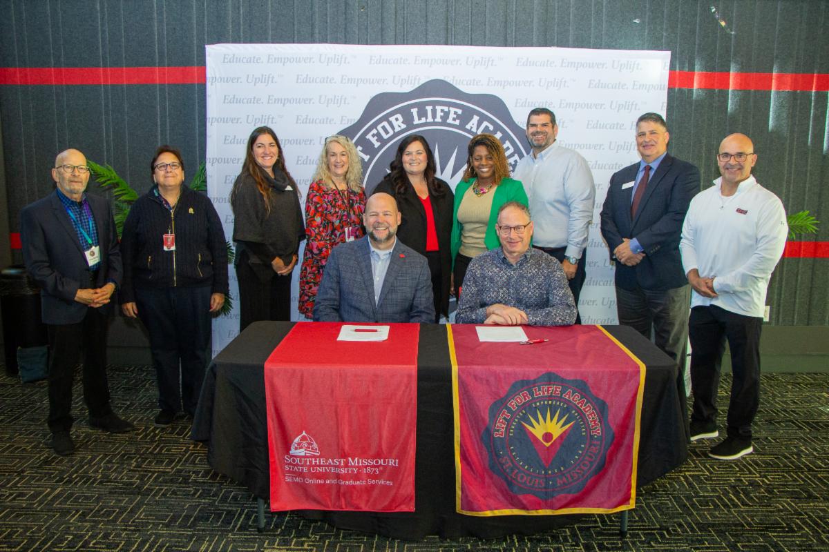 | | (Back Row, L to R) Rick Rovak, LFLA Board Member; Susan Kelter, LFLA Director of External Relations; Dr. Mel Odegard, SEMO Interim Dean College of Education, Health, Human Studies; Julie Derby, LFLA Director of Human Resources; Dr. Chelsea McNeely, Director of SEMO Online and Graduate Services; Dr. Katrice Noble, LFLA Deputy Director; Dr. David LeMay, LFLA Director of Operations; Ron Tucker, SEMO Charter School Liaison; Andy Comstock, SEMO Project Coordinator Educator Advantage Partnerships; (Front Row, L to R) Dr. Brad Hodson, President of Southeast Missouri State University; Marshall Cohen, Executive Director and Co-Founder of Lift For Life Academy | | | | |