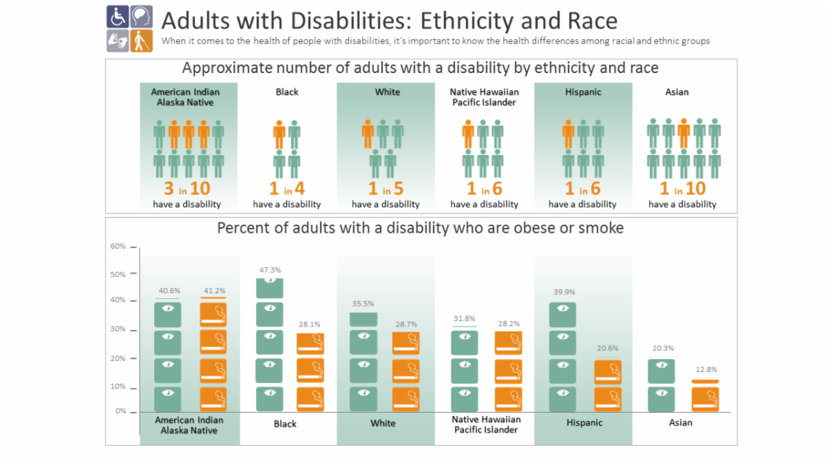 When it comes to the health of people with disabilities, it’s important to know the health differences among racial and ethnic groups. This infographic by the Center on Disease Control shows the approximate number of adults with a disability by ethnicity and race.