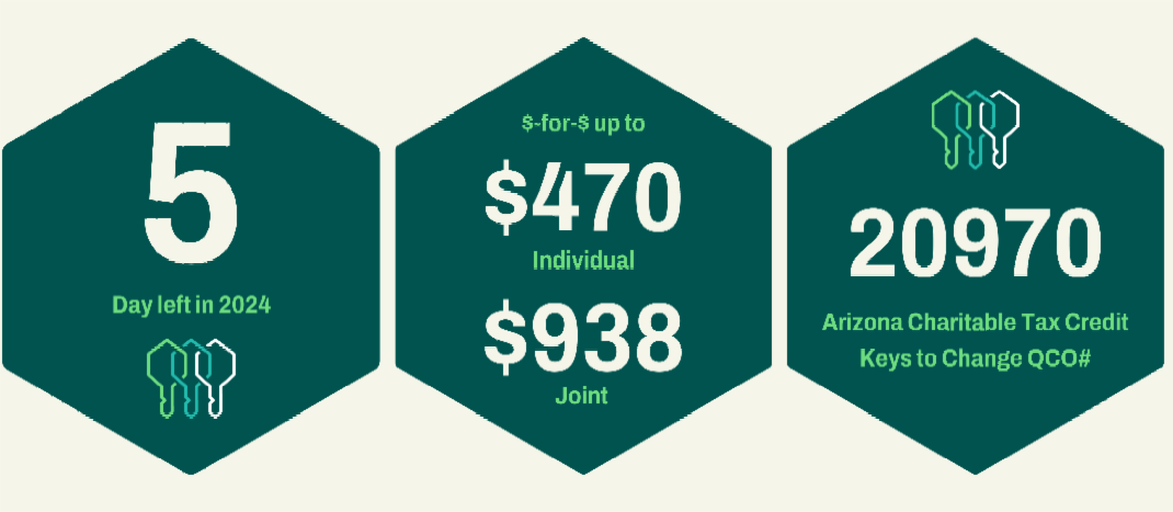 With the Arizona Charitable Tax Credit, you can donate up to $470 as an individual or $938 for a couple filing jointly, and receive a dollar-for-dollar credit on your AZ state taxes. Simply claim your credit using QCO code 20970 on Arizona Form 321 when filing your state income taxes.