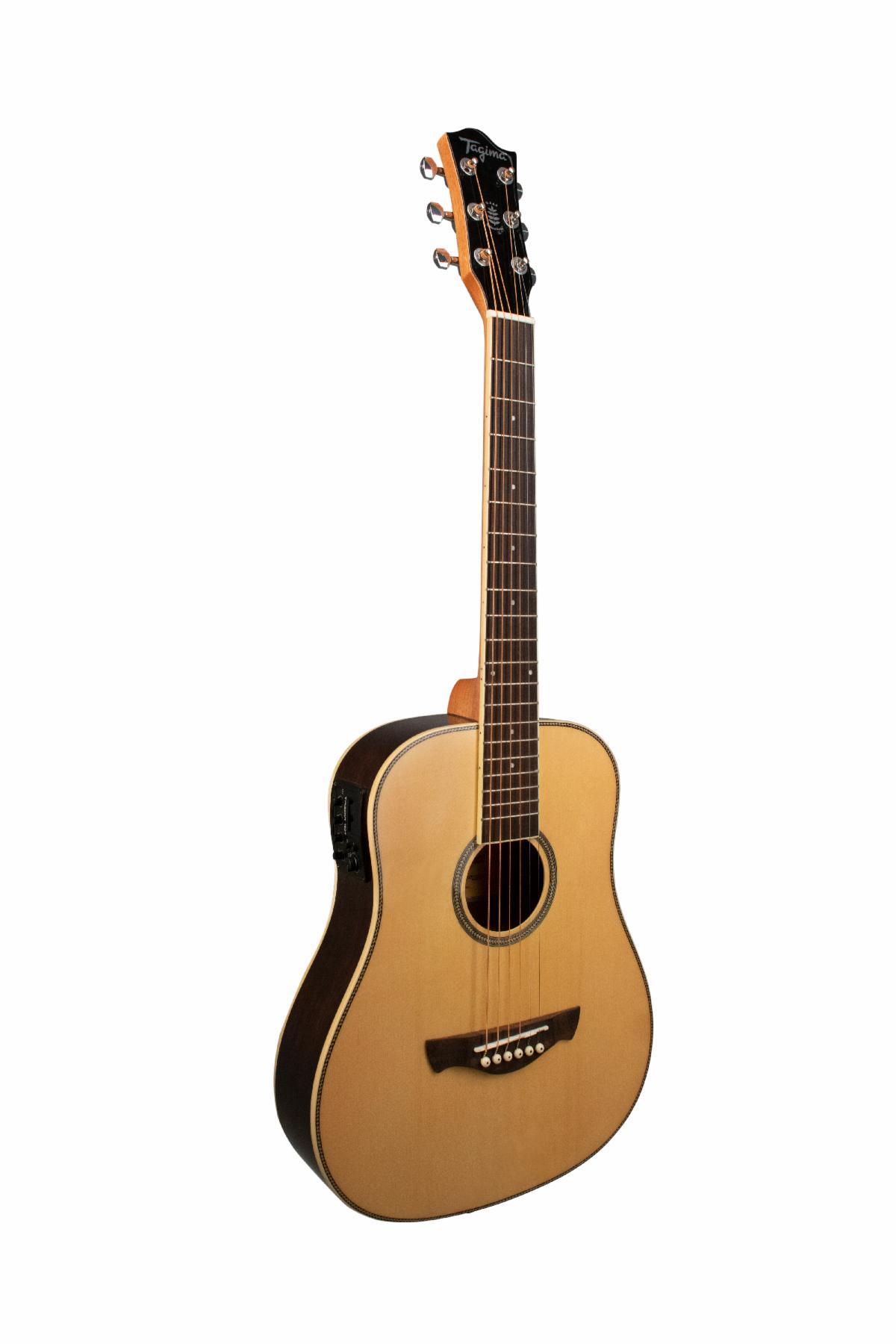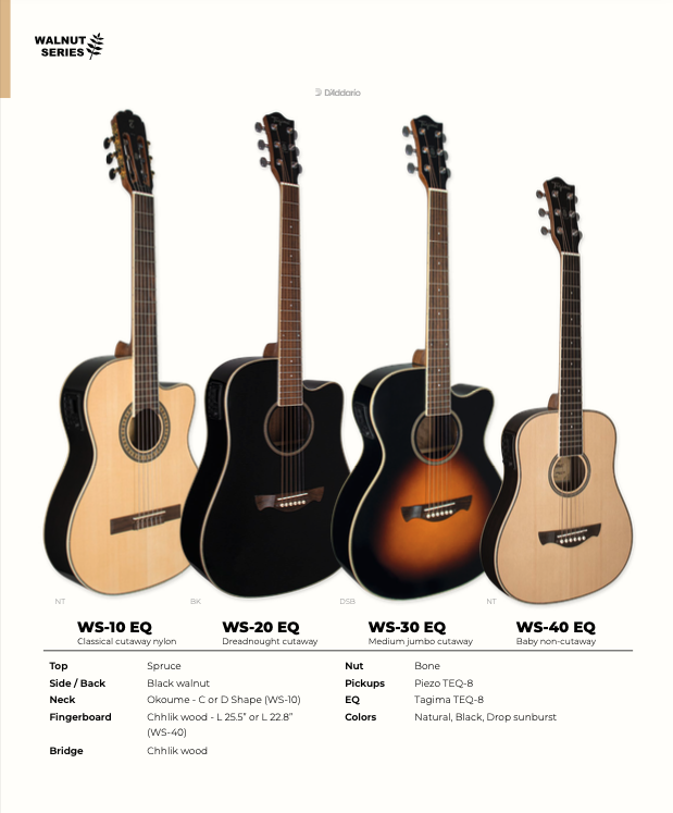 Tagima WS 40 3/4 size guitar with electronics. Layered Spruce Top with Black Walnut Back and Sides. Chhlik Wood fingerboard. Tagima Designed Piezo pickup with Tagima Designed TEQ 8 equalizer with an onboard tuner.