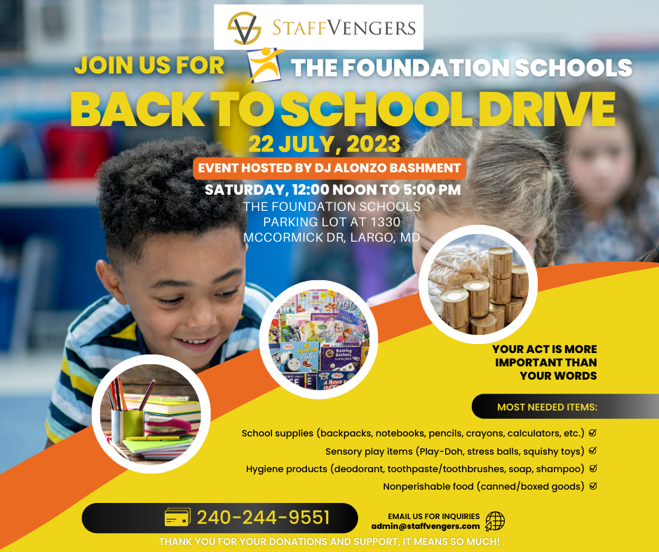 On Saturday, July 22nd join us for a free Back to School Drive event at The Foundation School in Largo, located at 1330 McCormick Drive Largo, Maryland! From 12:00 PM to 5:00 PM, we will be collecting school supplies and basic needs for our students to start the new school year strong. Come and enjoy some light refreshments, a moon bounce, and face painting, courtesy of our friends at Staff Vengers!