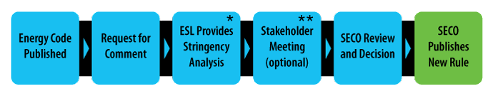 The process includes a public comment period, technical review by the Energy Systems Laboratory (ESL), and stakeholder meetings to assess energy savings, cost-effectiveness, and housing impacts. Once approved, new codes take effect no sooner than nine months after adoption, giving cities and builders time to prepare.