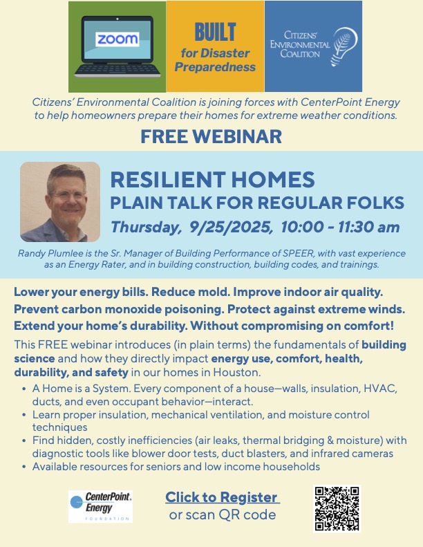 Join Citizens’ Environmental Coalition and CenterPoint Energy for a free webinar that breaks down the essentials of building science in easy-to-understand language. Learn how to lower energy bills, reduce mold, improve indoor air quality, and protect your home against extreme weather. Randy Plumlee, Sr. Manager of Building Performance at SPEER, will share practical tips on insulation, ventilation, and moisture control, plus how to spot costly inefficiencies. Perfect for Houston homeowners, seniors, and low-income households looking to improve comfort, health, durability, and safety—without sacrificing affordability.