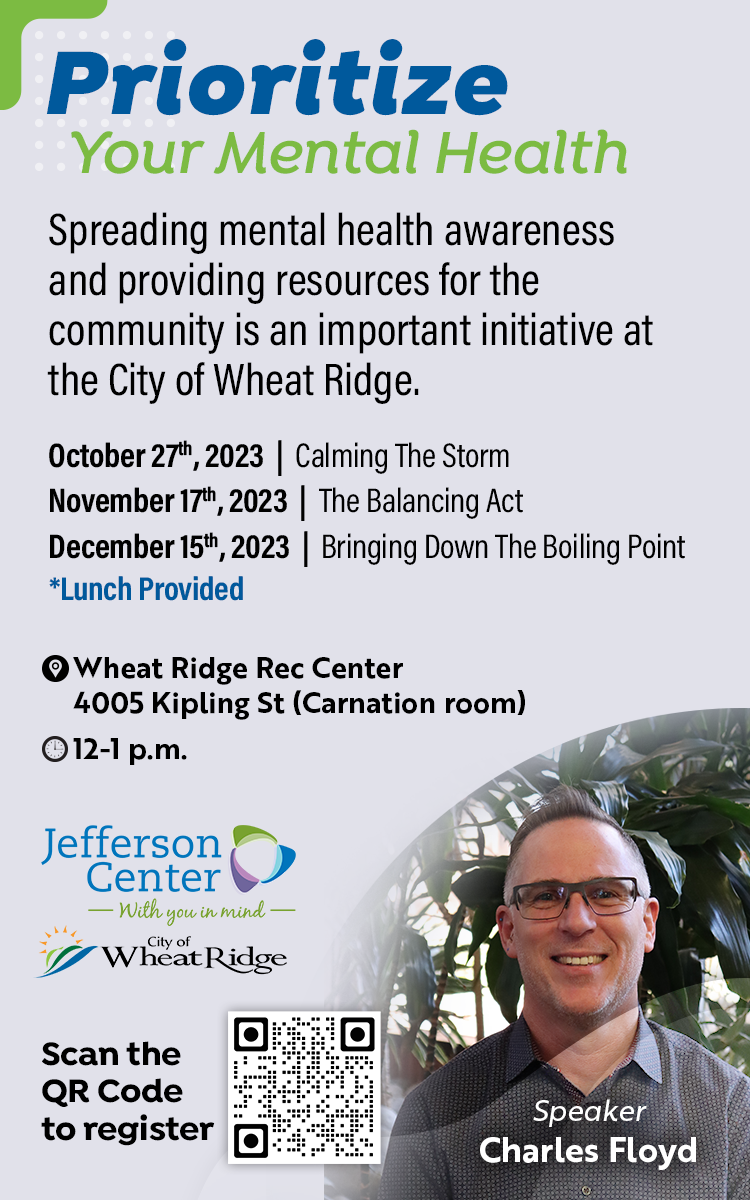 The City of Wheat Ridge is excited to partner with Jefferson Center for another Mental Health and Wellness Series. Presentations will be offered from noon to 1 p.m. - Oct. 27, Nov. 17, and Dec 15 - at the Wheat Ridge Recreation Center, 4005 Kipling Street. The series is free and lunch will be provided. Registration is required. Learn more about the series and register.
