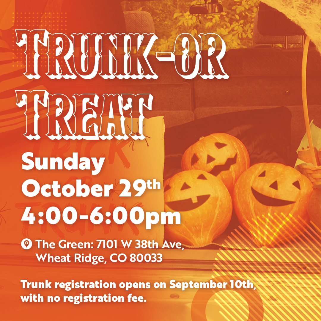 Join Wheat Ridge Parks & Recreation on Sunday, Oct. 29, from 4 to 6 p.m. for Trunk-or-Treat. Participants decorate their cars and trucks with creative disguises to delight kids and distribute candy to celebrate Halloween. Trick-or-treaters are invited to vote for their favorite trunks, and a prize will be awarded to the winner.