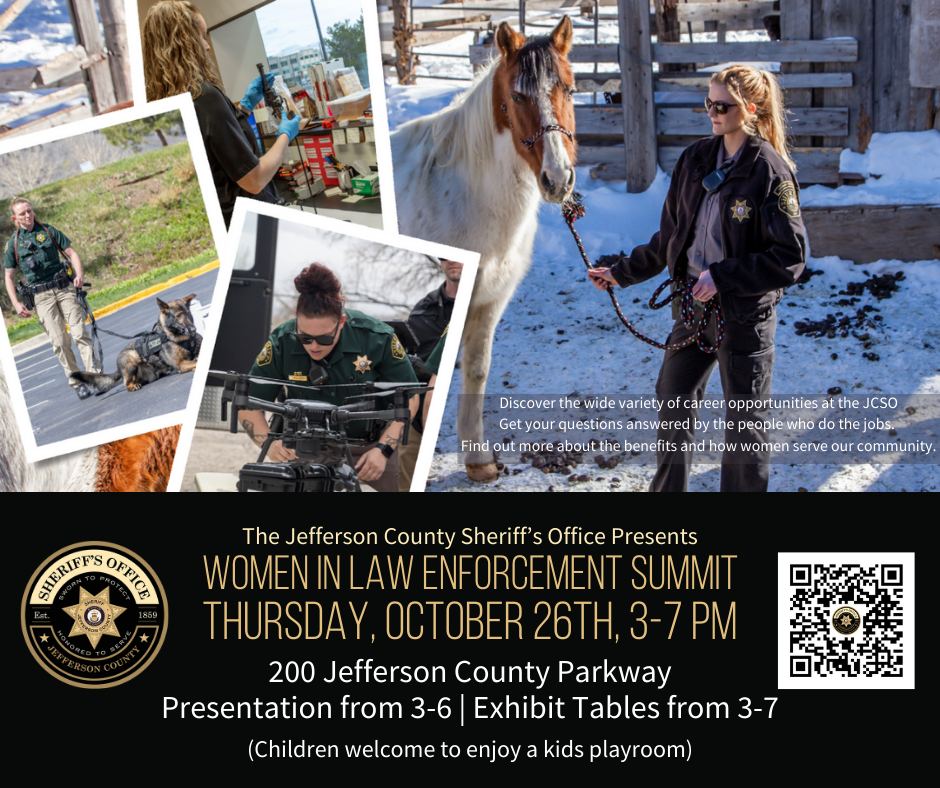 The Jefferson County Sheriff’s Office Women of Law Enforcement Summit is 3 to 7 p.m. on Oct. 26 at the Sheriff’s Office, 200 Jefferson County Parkway in Golden. Meet and learn about the women behind the badge and the professional women who work in support roles at the sheriff’s office. It’s a great opportunity to hear about the various career options available to women in law enforcement.