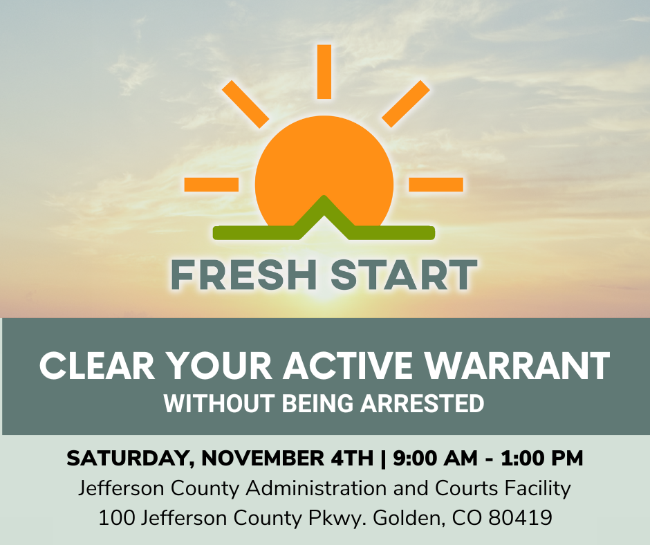 The First Judicial District will hold its next Fresh Start event on Saturday, Nov. 4, at the Jefferson County Administration and Courts Facility, 100 Jefferson County Parkway in Golden. Fresh Start will not only benefit individuals with outstanding warrants but also will cut down on the costs to taxpayers and allow law enforcement to direct their resources toward offenders who commit higher level crimes and directly victimize others in the community. View the Fresh Start event flyer.