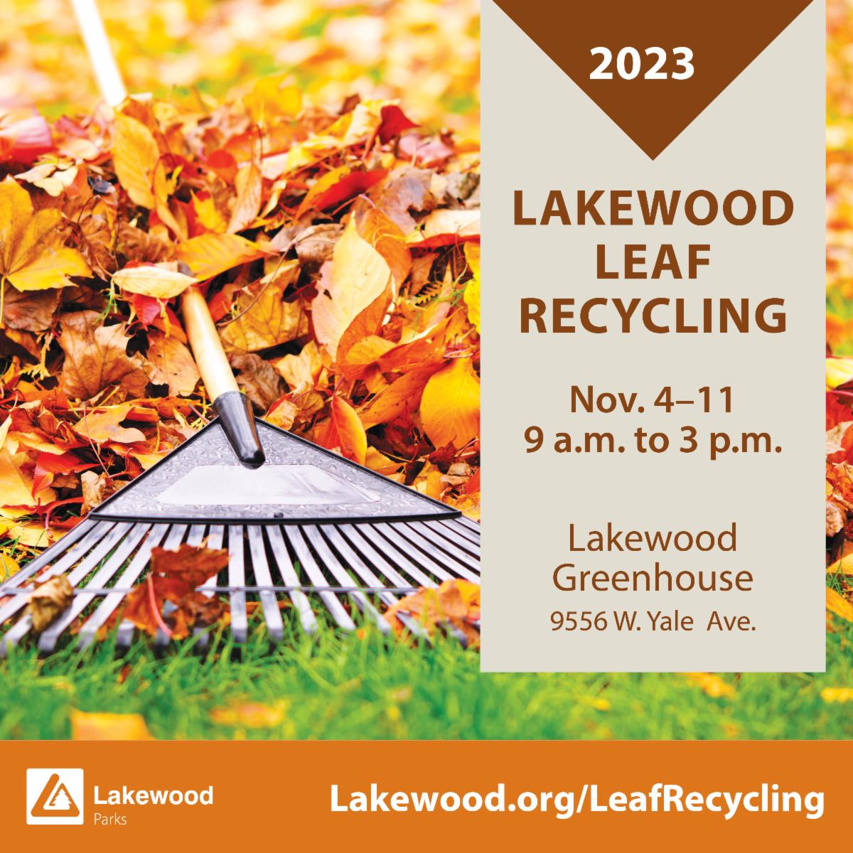Lakewood is introducing a new leaf recycling event as a part of an initiative to support residents’ fall cleanup and spread awareness about the proper disposal of leaves. Free leaf drop-off will take place from Nov. 4-11, 9 a.m. to 3 p.m. daily, at the city Greenhouse, 9556 W. Yale Avenue. Staff will be available to assist residents on Nov. 4 and Nov. 11. Get more information or call 720-963-5240 if you have questions.