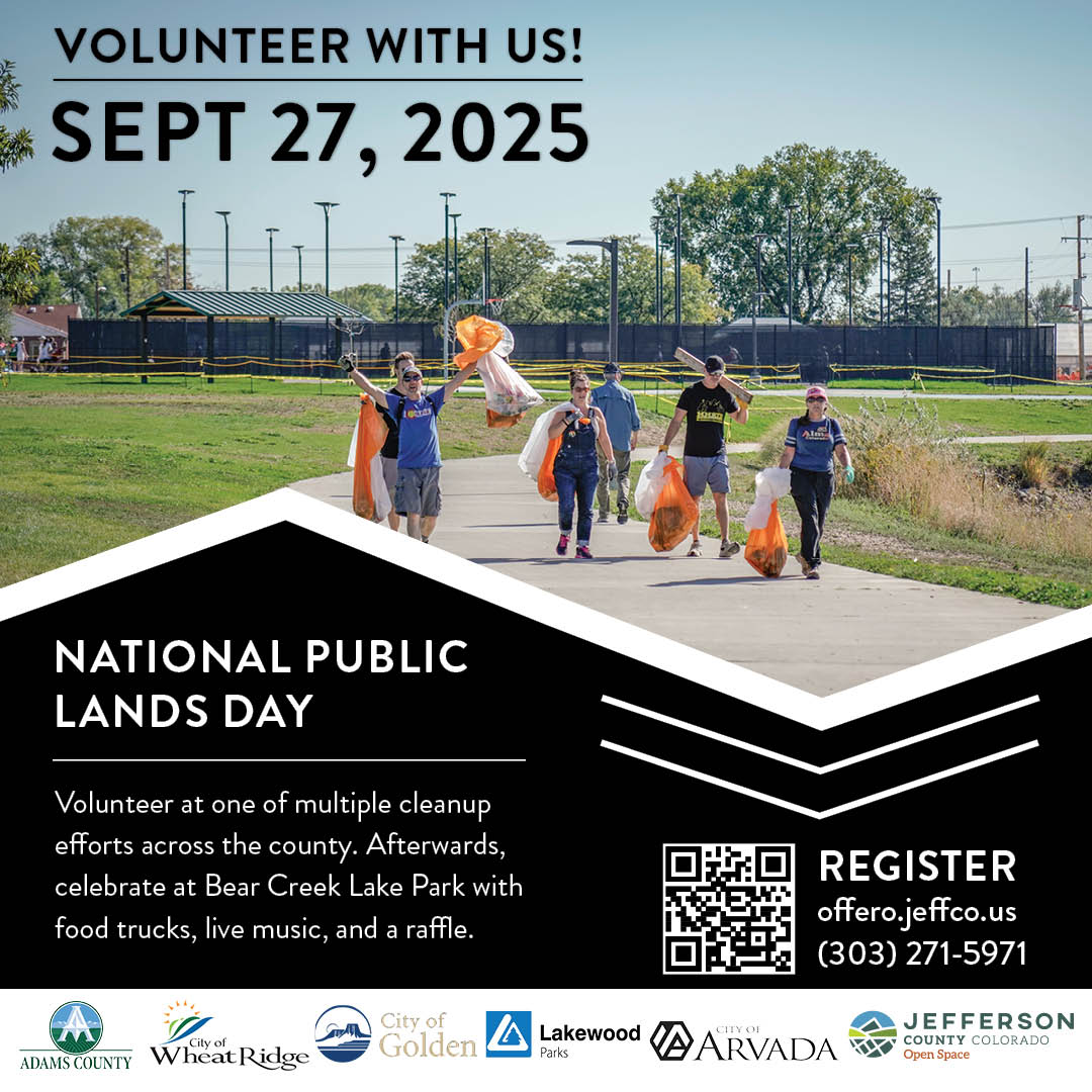 Join Parks & Open Space in celebrating National Public Lands Day on Sept. 27 by lending a hand to care for the incredible outdoor spaces we all enjoy in Jefferson County. And after the hard work is done, stick around for the after party! Enjoy free food, cool beverages, fabulous raffle prizes, live music and stunning scenery.