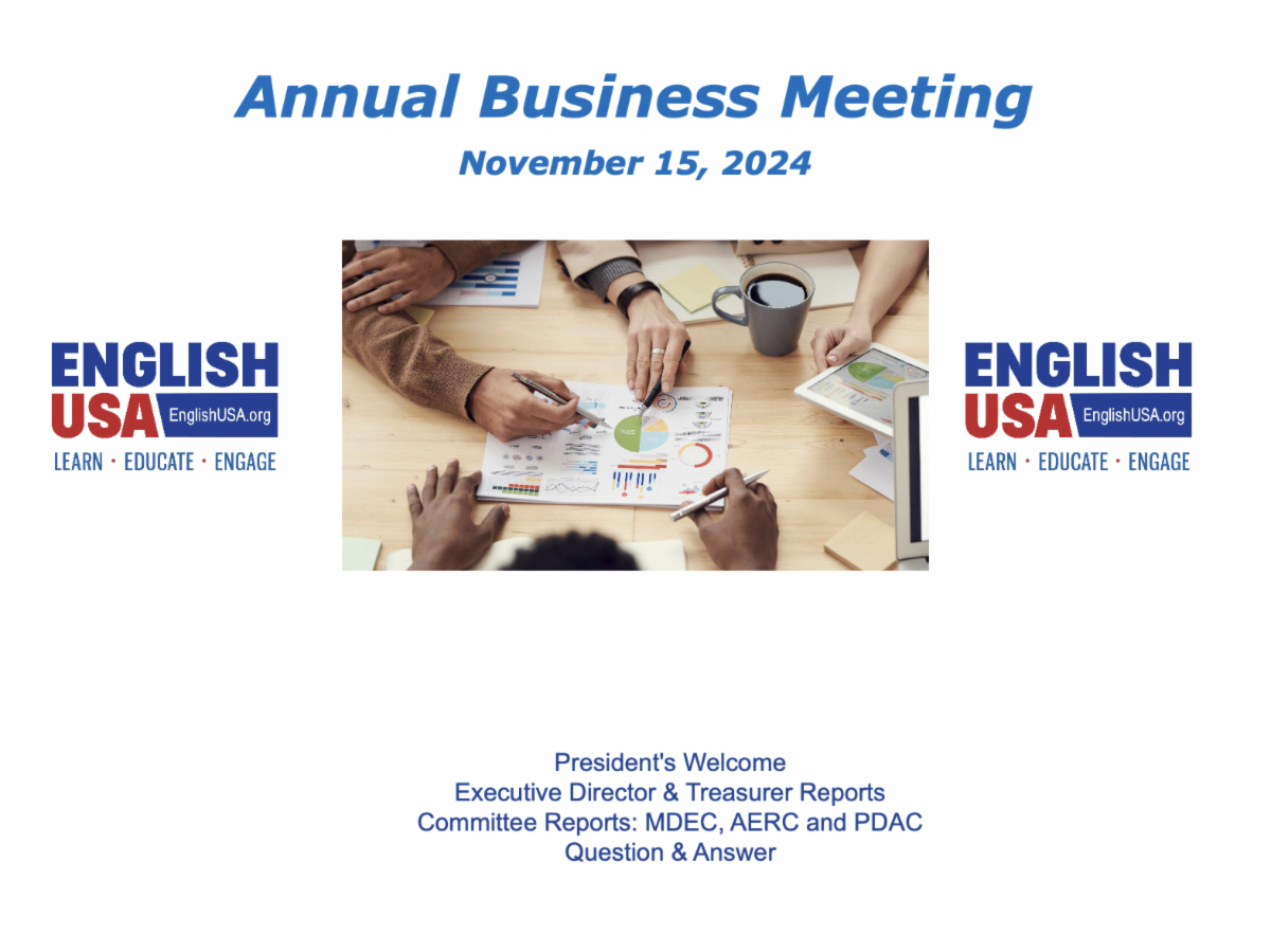If you missed the EnglishUSA Annual Business Meeting, the recording and slides are available on the website here. You must be logged in to access the recording and slides. | |