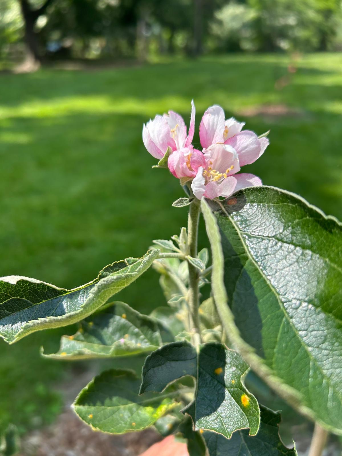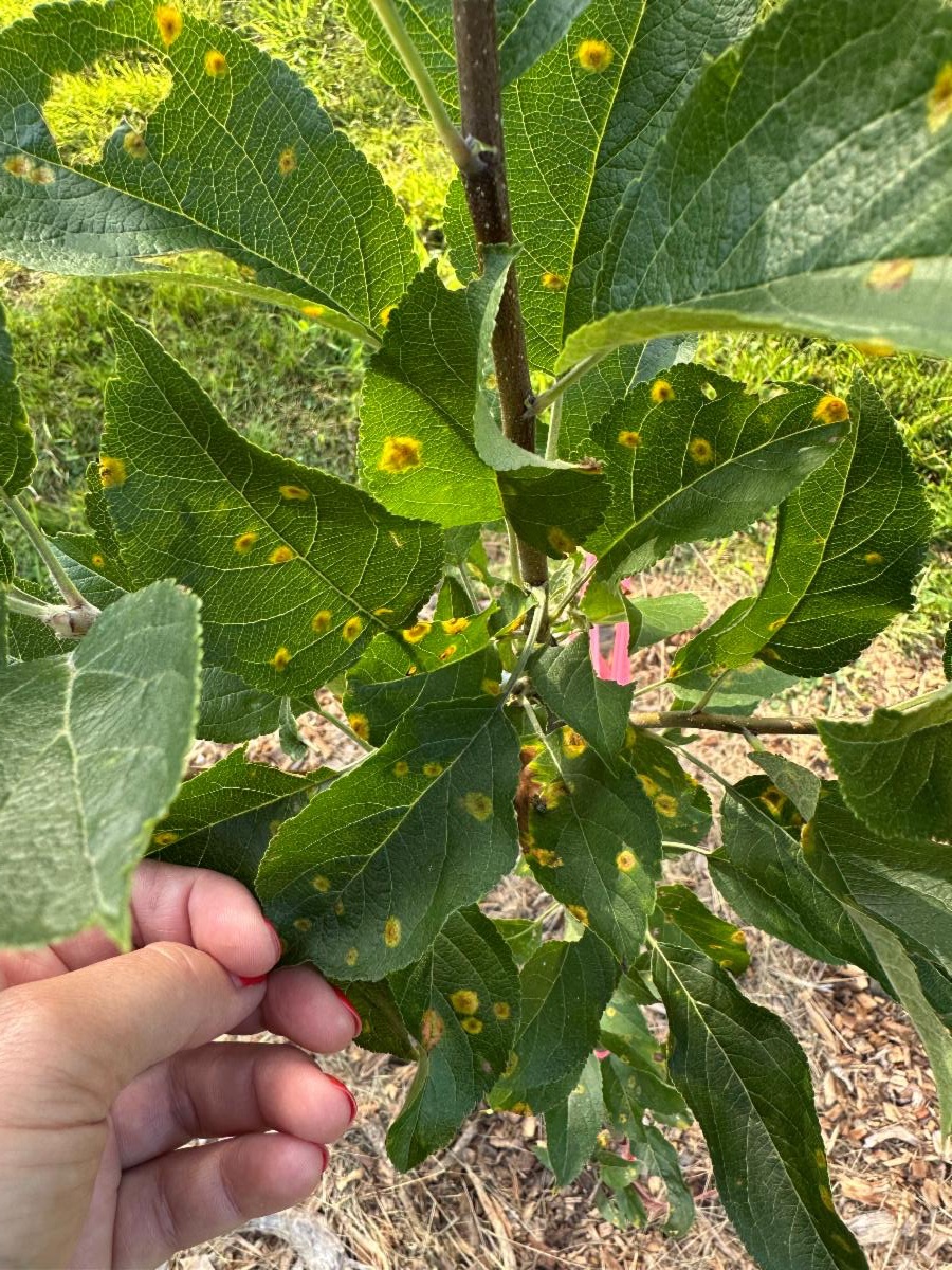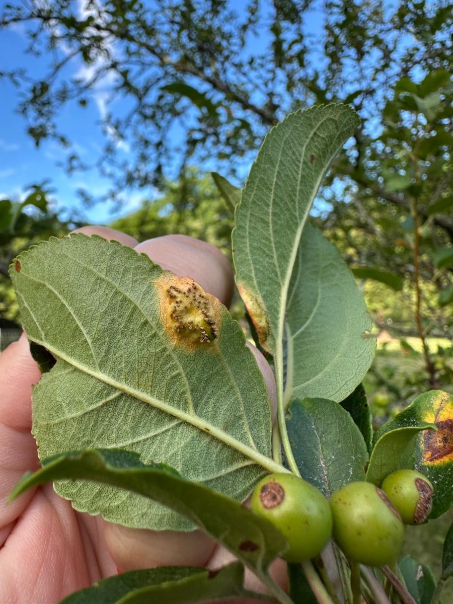 Disease in fruit trees is a common challenge among all levels of orchardists. This was one of the main considerations taken when selecting the new apple trees for the orchard renovation in the spring of 2025. Our staff prioritized disease resistant varieties, with a focus on resistance to cedar apple rust and fire blight, as both diseases could be lethal to the young trees. To be proactive and catch these issues early, the staff began checking the orchard almost daily and taking detailed notes and observations monthly. Since these trees are still being watered regularly as they establish, this is the perfect time to do a thorough check up on each individual. During the monthly in-depth checkup, notes are taken on evidence of cedar apple rust, insect activity, and signs of stress or other pathogens. This also gives an opportunity to note specific flowering dates and fruit development.